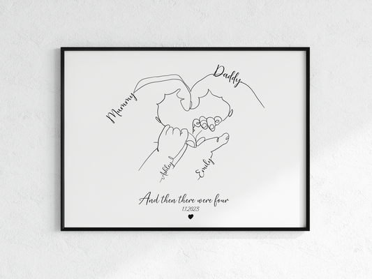 Personalized Family Hands Line Art Print – “And Then There Were Four” – Custom Minimalist Drawing with Names & Date